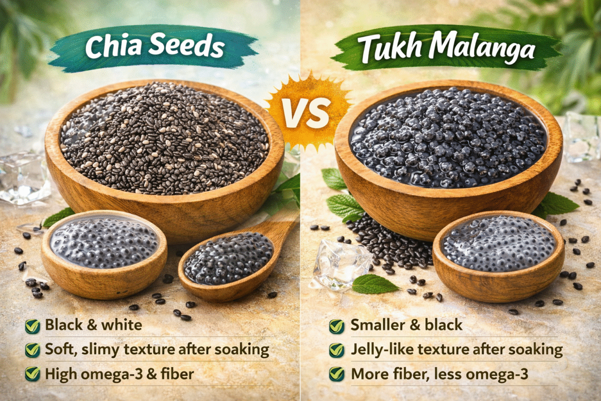 Tukh Malanga and chia seeds may resemble each other in appearance, but Tukh Malanga absorbs more water. Chia seeds, on the other hand, trend towards drier modes of operation.